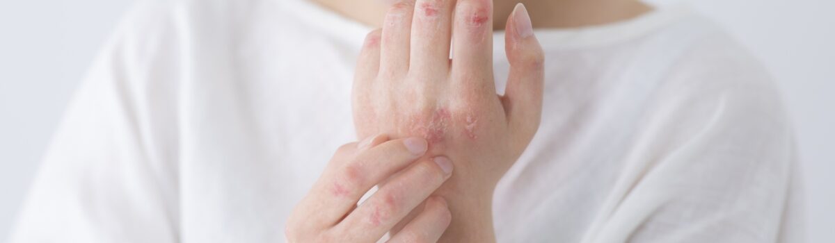 湿疹の症状を2ヶ月以上繰り返す場合、アトピー性皮膚炎の疑いがあります。頭部、顔、体幹に湿疹が広がり、左右対称である場合、要注意です。