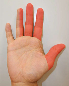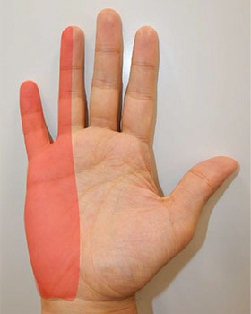手首にある手根管の中を通る「正中神経」が圧迫されることで、手・手指のしびれ、痛みといった症状が引き起こされます。手の酷使を主な原因とします。また女性の場合、妊娠・出産、更年期の女性ホルモンのバランスの変化も、発症に影響すると言われています。