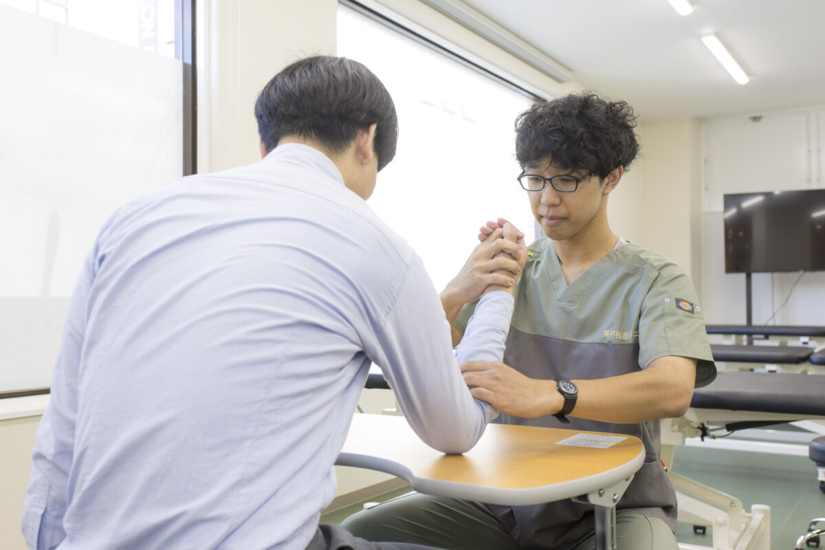 肘を伸ばした状態で、手首を上に反らし、医師が逆方向に力を加えた時の、肘の痛みの出方を確認します。